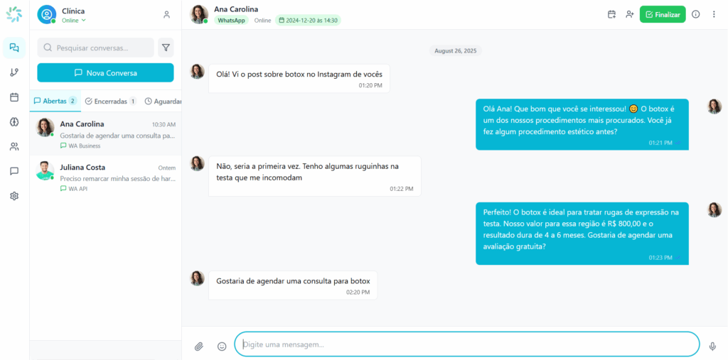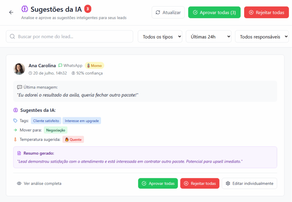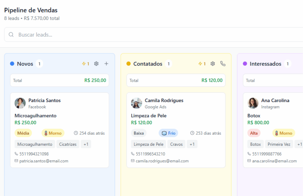 O UNO CRM se destaca por ser mais do que apenas uma ferramenta de gestão. Ele utiliza inteligência artificial para analisar as mensagens e sugerir ações diretamente para sua equipe, como mover leads para negociação ou identificar clientes satisfeitos. Ele também oferece integração multicanal, um pipeline emocional e um sistema de gestão por setor, tudo em uma plataforma única e fácil de usar.